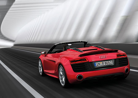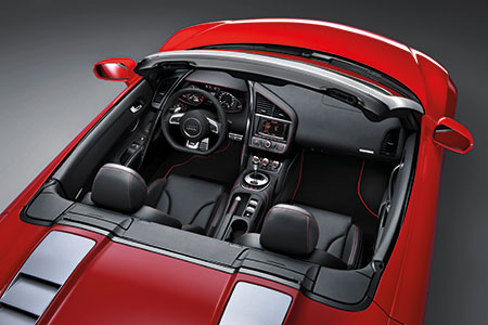 Fotos: Audi AGDer R8 war von seinen Schöpfern von Anfang an als sportliche Speerspitze im Modellprogramm gedacht. Seit einer Produktaufwertung 2012 präsentiert sich der Hochleistungssportler mit vielen Verbesserungen, darunter eine neu entwickelte Siebengang S tronic. Das Exterieurdesign zeigt sich weiter geschärft, am markantesten sind die neu strukturierten LED-Scheinwerfer, die jetzt durchgängig Serie sind, der sechseckige Singleframe-Grill und die großen Abgas-Endrohrblenden. Auch in der Ultra-Leichtbau-Technologie beweist Audi sein ganzes Können. Das überarbeitete R8 Cabrio namens Spyder bringt die gleichen Neuerungen wie das Coupé mit. Die Karosserie des offenen Liebhaber-stücks wiegt gerade einmal 216 Kilogramm, das Stoffverdeck aus Aluminium und Magnesium ist leicht und kompakt. Es lässt sich in 19 Sekunden elektrohydraulisch öffnen und schließen, auch während der Fahrt bis 50 km/h. In geschlossenem Zustand läuft es in zwei langen, schlanken Finnen aus. Das Softtop, dessen Gestänge von einem Innenhimmel abgedeckt wird, ist leise und ohne Abstriche highspeedtauglich. Eine beheizbare Glasscheibe in der Schottwand lässt sich per Schalter ein- und ausfahren und übernimmt damit die Funktion des Windschotts. Die Fahrleistungen und Verbrauchswerte des R8 Spyder unterscheiden sich nur minimal von der Coupé-Version. Die Cabrio-Motorenpalette mit einem 4.2 FSI quattro mit 316 kW (430 PS) sowie einem 5.2 FSI quattro mit 386 kW (525 PS) sorgt für Geschwindigkeiten jenseits der 300 km/h. Gibt es dafür eigentlich schon die passenden Küstenstraßen…