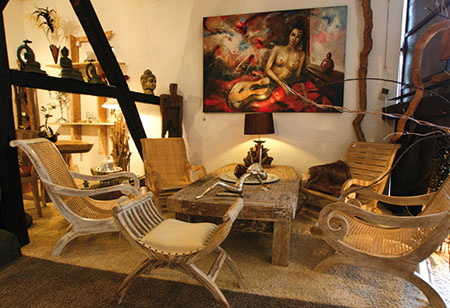 Neben außergewöhnlichem Mobiliar und seltenen Accessoires gehören auch exotische Plastiken, Steinfiguren und großformatige Öl- und Acrylbilder verschiedenster Künstler sowie Kunstrichtungen zum Programm. Und so herrscht eine ganz eigene Stimmung in der 170 qm großen Scheune: Ledersessel bieten Plätze zum Verweilen, Buddhafiguren und große Gemälde sorgen für Seelenruhe, Holzlampen spenden dem Besucher sanftes Licht. Sehr gut geeignet für eine kleine Reise - auf der Suche nach dem Besonderen aus fremden Ländern und dem Charme ferner Kulturen.