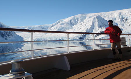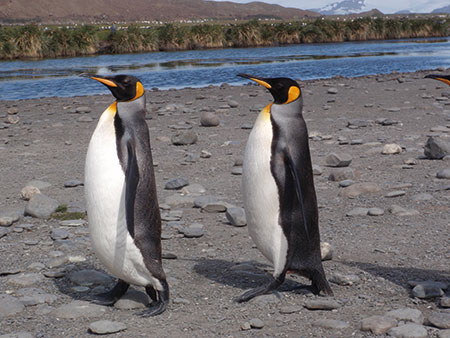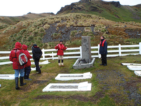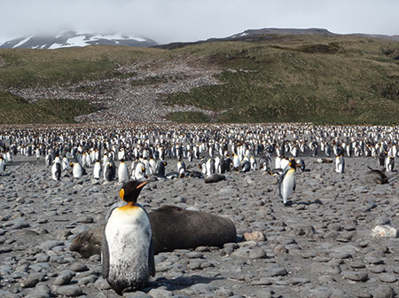 Jeden Tag sinken die Temperaturen um ein paar Grad. Keine anderen Schiffe mehr in Sicht, auch die Seevögel werden rar. Ankunft in South Georgia. Dort gibt es riesige Pinguinkolonien an den Kieselstränden und nackten Felshängen zu sehen. Der Schnee ist tiefrot vom Krill. Über die Badeplattform geht es mit Schlauchbooten durchs eiskalte Wasser auf den Subkontinent. Jeder der Expeditionsleiter hat mindestens einmal an den Polen überwintert und weiß, wie man diese lebensfeindlichen Umstände meistert. Drei bis vier Stunden auf Landgang. Fotografen sind mit riesigen Objektiven unterwegs, ein kanadisches Fernsehteam vom Discovery Channel sucht Spuren der Zivilisation. Es gibt kaum welche.