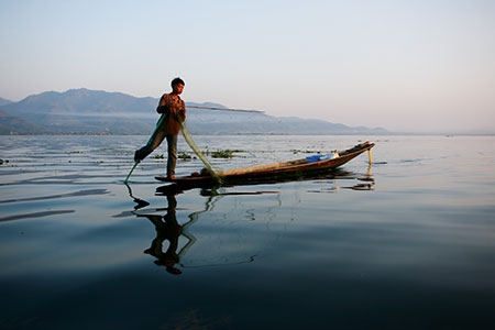 Tatsächlich haben die „Menschen des Sees“, wie das Wort Intha übersetzt bedeutet, den Lake Inle zu ihrem Lebensraum gemacht. Insgesamt leben hier etwa 100.000 Menschen, neben den Intha auch die Stämme der Shan, Danu oder Birmanen. Auch einige der berühmten „Giraffenhalsfrauen“ mit den langen Hälsen, die durch Kupferspiralen über Jahre gestreckt werden, sind hier zu finden. Sie stammen von den Padaung, einem Bergvolk im Südosten Myanmars, wie Burma auch genannt wird. Im benachbarten Thailand sind die „Giraffenhalsfrauen“ in manchen Schaudörfern ebenfalls ein bekannter Anblick. Viele Padaung-Mädchen tragen von Kindheit an diesen schweren Halsschmuck, der die Schultern deformiert und den Hals optisch extrem verlängert. Nicht nur deshalb wird innerhalb Burmas eine Reise zu dem auf 900 Metern Höhe gelegenen See noch einmal zum besonderen Highlight mit beinahe magischen Momentaufnahmen. Im Verlauf unserer MEERraum-Fotoexpedition verbringen wir 2 Tage am Lake Inle und lernen in dieser Zeit, was es wirklich bedeutet, mit dem Wasser zu leben.
