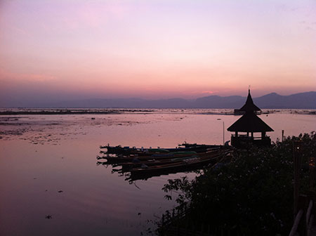22 Kilometer lang, 10 Kilometer breit. Touristen werden in Holzbooten mit Motorkraft über den Lake Inle geschippert. Überall dort, wo Waren produziert werden & Kunsthandwerk entsteht, warten kleinere Holzboote, in denen Frauen oder Kinder ihre Souvenirs feilbieten: filigraner Silberschmuck und Buddha-Figuren, Holzschnitzarbeiten, feine Seidenstoffe oder Zigaretten. Wir lernen sehr schnell, dass man nachts vor allem warme Kleidung braucht. Während tagsüber angenehme 30 Grad wärmen, sinkt die Temperatur dann auf etwa 11 Grad. Über dem See das Panorama der umgebenden Bergketten und eine beeindruckende Stille.