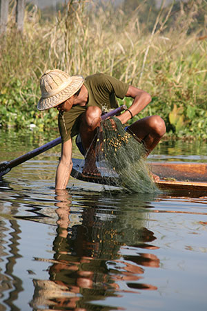 Auf dem See und am Ufer haben sich insgesamt 17 Dörfer angesiedelt. Alle Häuser sind auf Pfählen gebaut, zwischen den Gebäuden und Feldern wird in schmalen Kanälen mit Kanus navigiert. Kurios: Ein Postamt mitten auf dem See, natürlich auf Stelzen. Ebenso Pagoden mit Buddhafiguren, das über 160 Jahre alte Kloster Nga Phe Kyaung oder eine Zigarettenfabrik. Auf dem Wasser zahlreiche Fischer, die „Einbeinruderer“, die in Holzbooten nach der traditionellen Methode auf Fischfang gehen: auf den schmalen Booten balancierend, halten sie mit einem Fuß das Ruder und bewegen es im Stehen. So bleiben die Hände zum Fischen und Dirigieren des Netzes frei. Sie haben den See mittlerweile in der ganzen Welt bekannt gemacht. Die in Restaurants frisch zubereiteten Karpfen sind später eine wahre Delikatesse.