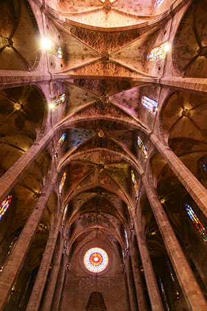 Das Innenleben von La Seu birgt einige prachtvolle und beeindruckende Geheimnisse. So gilt das 1599 verglaste Rundfenster mit 97,5 qm Fläche als größte gotische Rosette der Welt - die an zwei Tagen im Jahr vom Sonnenuntergang spektakulär beleuchtet wird. Vom berühmten Architekt Antoni Gaudi stammen Kunstelemente im Stil des katalanischen Modernisme, und die große Orgel ist das Werk des Mallorquiners Gabriel Tomás aus dem ausgehenden 18. Jahrhundert. In zwei Kapitelsälen und im Erdgeschoss des 48 m Glockenturms finden Besucher seit 1932 das Museum der Kathedrale, wo Fundamentmauern, Reliquien des Heiligen Sebastians und das silberne Buch des Königs zu sehen sind. Beeindruckt vom goldenen Licht und Gaudis schwebendem Baldachin verlassen wir das Gotteshaus wieder und spazieren in die Altstadt von Palma.